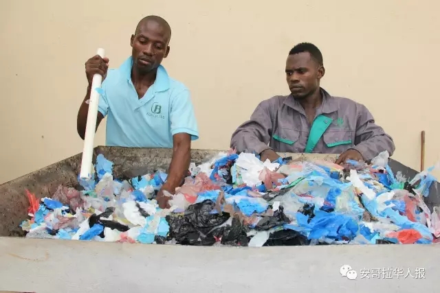Trabalhadores angolanos trituram e reciclam os resíduos plásticos.